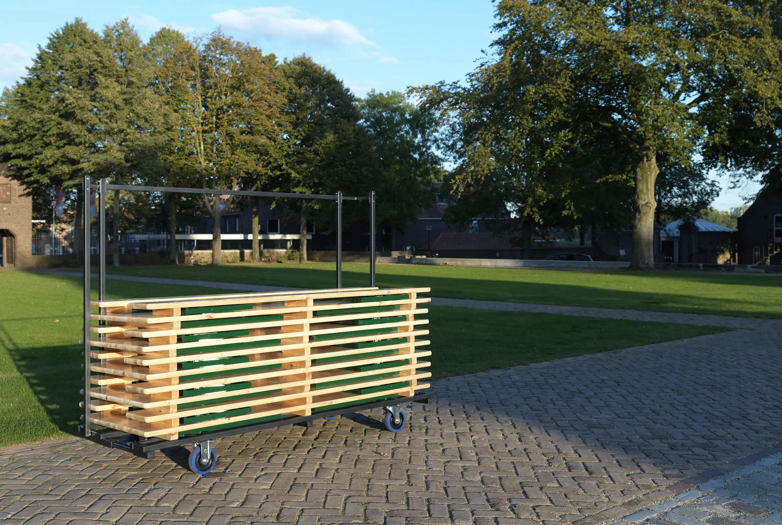 Deze uitschuifbare trolley is inzetbaar voor het vervoer en-/of de opslag van bierbanken van verschillende afmetingen. De trolley biedt plaats voor in totaal 10 complete sets, 20 losse tafels of 40 losse bankjes. Er zitten in totaal twee bokwielen en twee zwenkwielen met rem onder deze transportkar.